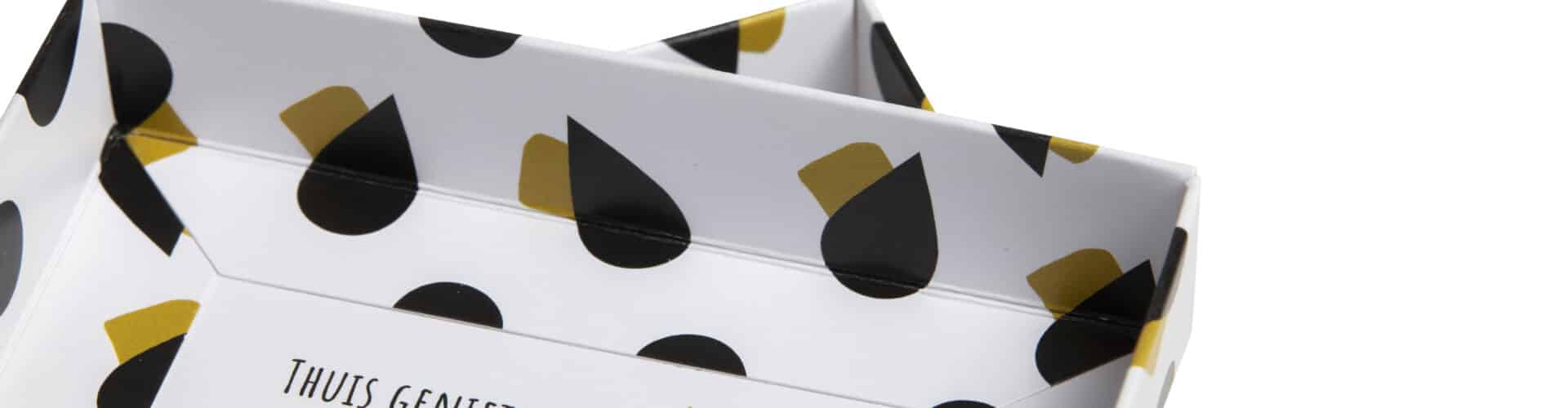 Wat bijzonder is aan deze cadeauverpakkingen is dat de deksel is veredeld met goudfolie. Met foliedruk wordt er een laagje folie over het drukwerk aangebracht. Foliedruk zorgt voor een luxe uitstraling en geeft een speciaal effect aan je drukwerk.